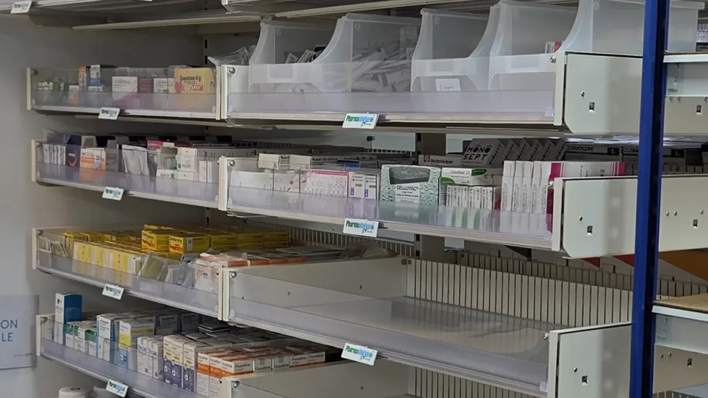 Ce système de rayonnage permet une organisation claire et rationnelle des produits, tout en garantissant une excellente accessibilité pour les équipes pharmaceutiques.